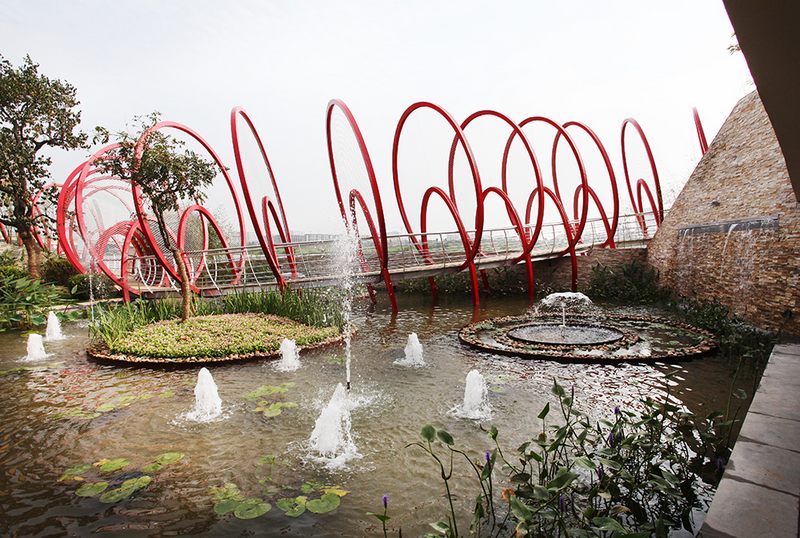 此屆園林博覽會在臨沂召開,恰逢中國傳統(tǒng)龍年,工程建設(shè)貫徹“水綠相映、生生不息—文化與自然共生”的主題,突出展示風(fēng)箏文化,園區(qū)占地2800余平方米,分降龍戲水、綠野河灘和睡蓮全池三個景區(qū),整體造型象征濰坊經(jīng)濟(jì)、文化的騰飛與發(fā)展。